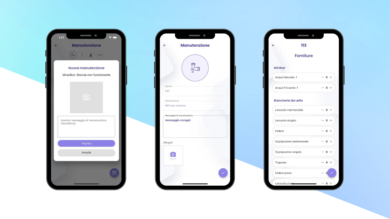 Semplifica le attività di Operatori e Manutentori con istruzioni passo-passo e aggiornamenti in tempo reale. Ricevi segnalazioni immediate di Manutenzioni e Lost & Found, garantendo un servizio rapido e impeccabile. Migliora la comunicazione interna, garantisci un’esperienza di soggiorno memorabile ai tuoi ospiti e fidelizza la tua clientela.